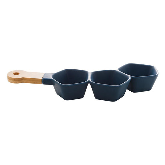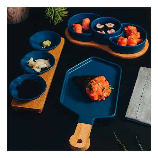 Petisqueira em porcelana com cabo bambu Azul Matt 40x19x2cm