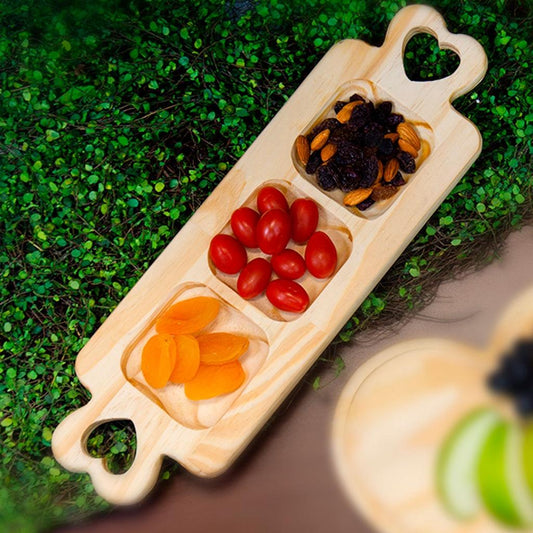 Petisqueira com 3 divisórias em madeira pinus com alça coração 40x13x2cm