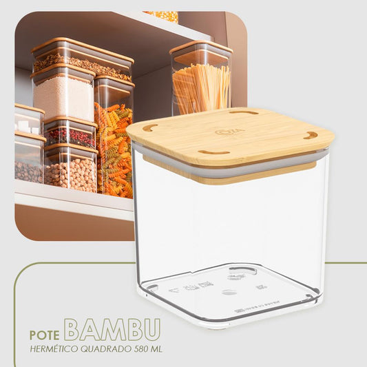 Pote Hermético Quadrado 580ml Tampa Bambu BPA Free Coza Prático E Moderno