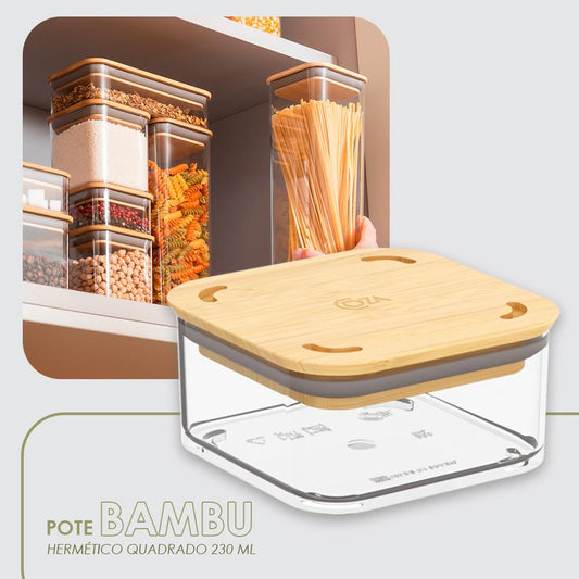 • Pote Hermético Quadrado 230ml Tampa Bambu BPA Free Coza