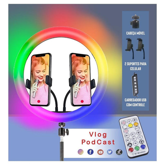 Luminária portátil USB Ring Light Color 12 polegadas, tripé e 2 adaptadores p/ Smartphone